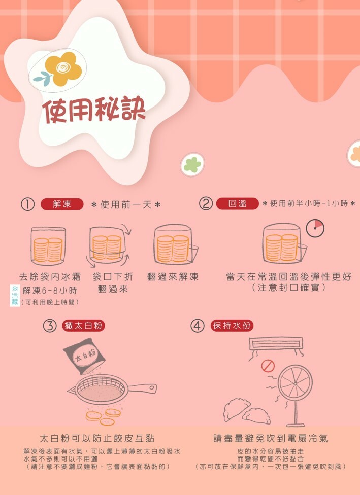 食用建議|製作完成後以急速冷凍保鮮,使用前需解凍及妥善回溫,麵皮彈性延展性更佳。冷凍一個月內包完手感最好,包完後盡量於三個月內吃完營養最佳。